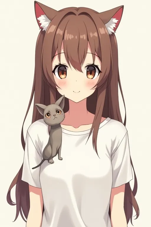 ((masterpiece,best quality))anime, halfBody portrait, character display is front, one female,european,brunette long hair, 17 years old,Normal bodytype,dress White T-shirt,expression is neutral, have cat