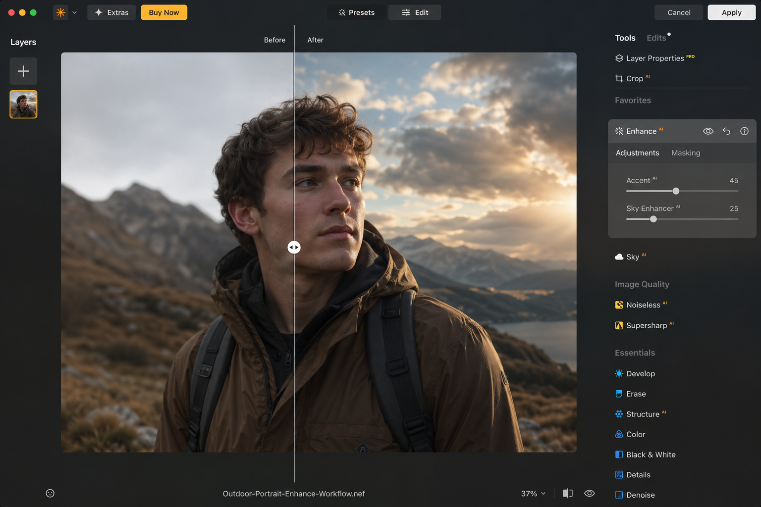 Luminar Neo stands out when you want AI to be the center of the workflow, not an add-on. It is one of the clearest examples of a photo editor that feels built around AI-assisted enhancement rather than retrofitted with a few AI features.