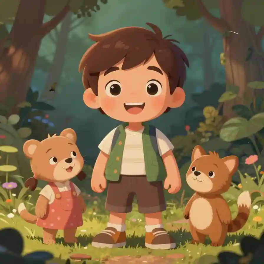 Wholesome manga style: expressive forest scene illustrations with clear emotion, readable subjects, and family-friendly details.