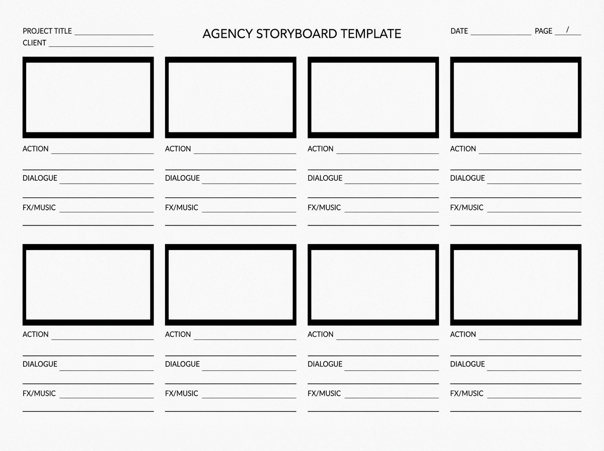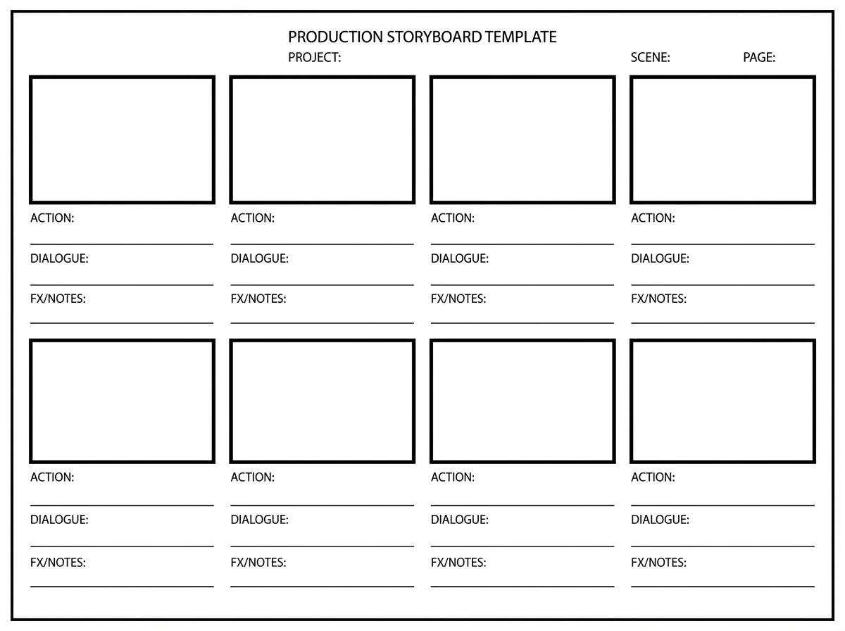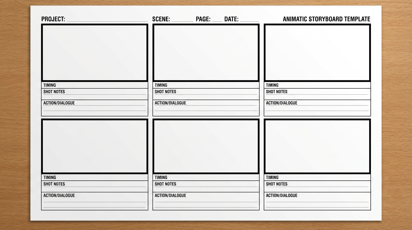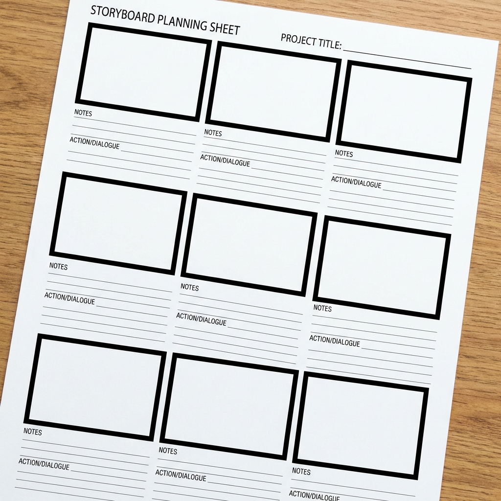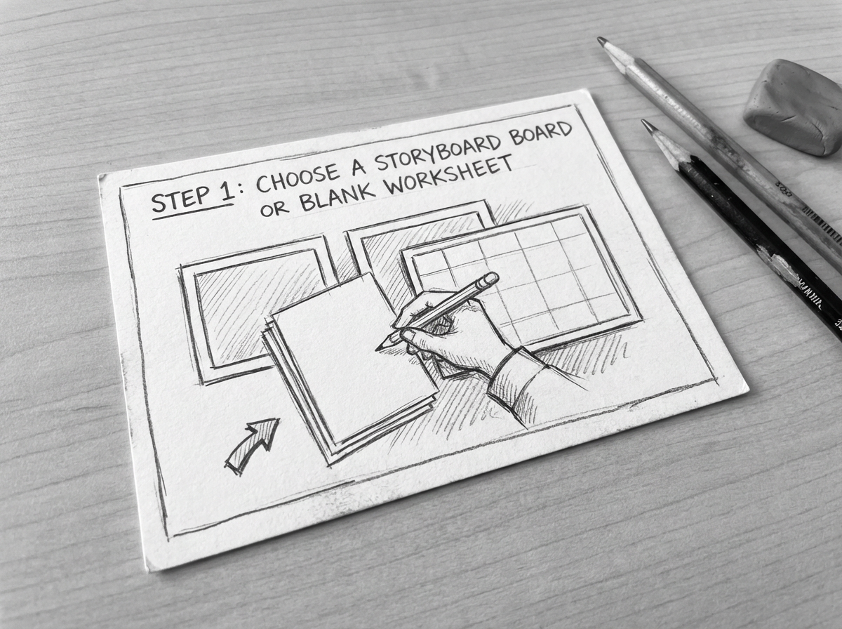 Start from a blank storyboard worksheet or a rough hand-drawn previz board.