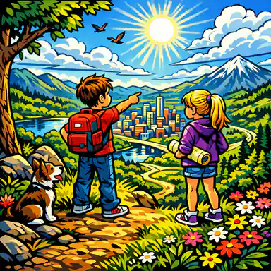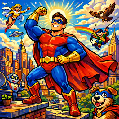 american comic illustration, bold, thick outlines,vibrant, high-contrast colors. Cheerful hero scene, expressive lighting, rich background detail, child-safe creator-ready AI art, image-only composition, No text, no words, no letters, no typography, no captions, no labels, no logos, no signage, no watermark.