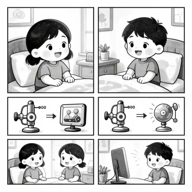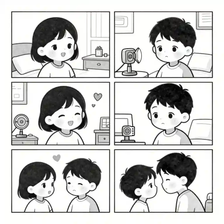 Manga-style, black-and-white, gentle shading, soft lighting, whimsical educational tone, two main characters, four-panel comic, cozy bedroom, clear technology diagrams. Concept art for a comic opening panel, new, storybook, children, optimistic story moment, high quality, image-only scene, No text, no words, no letters, no typography, no captions, no labels, no logos, no signage, no watermark.