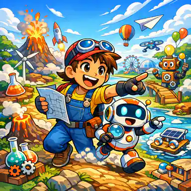 Same cheerful child inventor, teal jacket, round backpack, small helper robot, soft smile, consistent outfit details.