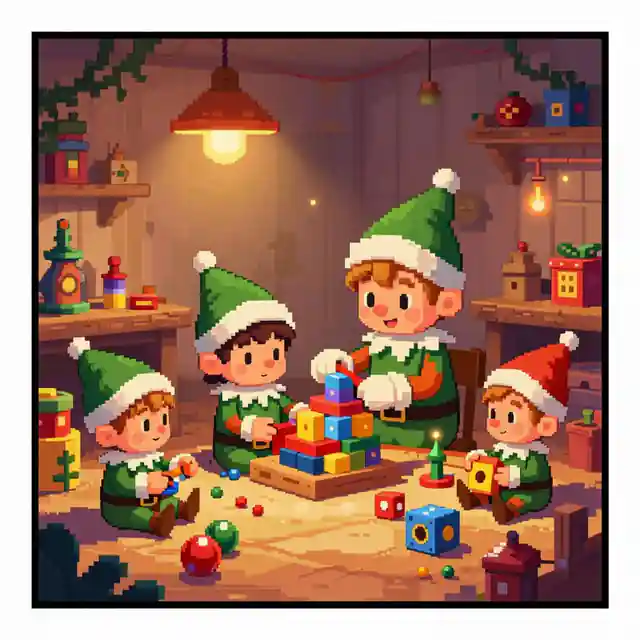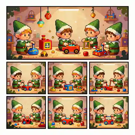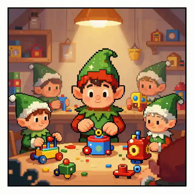 The source template points toward a comic in a retro pixel art style, set in a magical toy workshop. join playful elves as they design, build, and test toys while overcoming funny mishaps along the way. Use that as a style brief, then add your own cast, setting, emotion, camera angle, and scene purpose.
