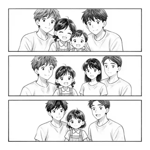 Wholesome comic storyboard illustrations with clear emotion, readable subjects, and family-friendly details.