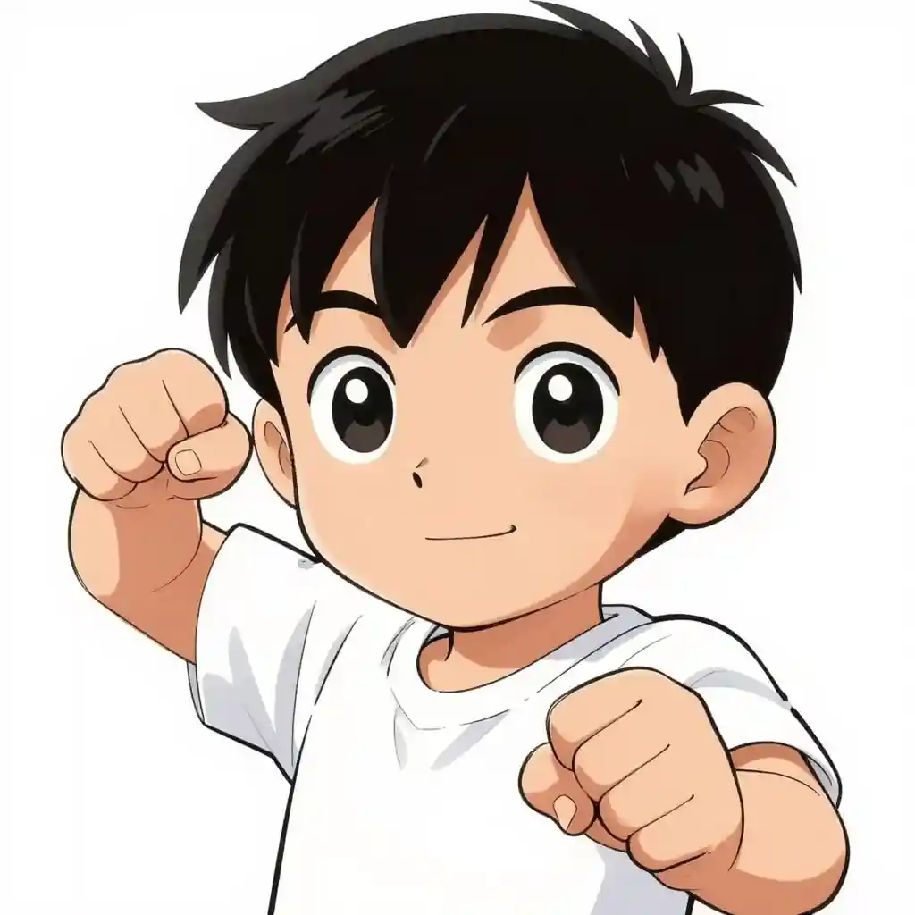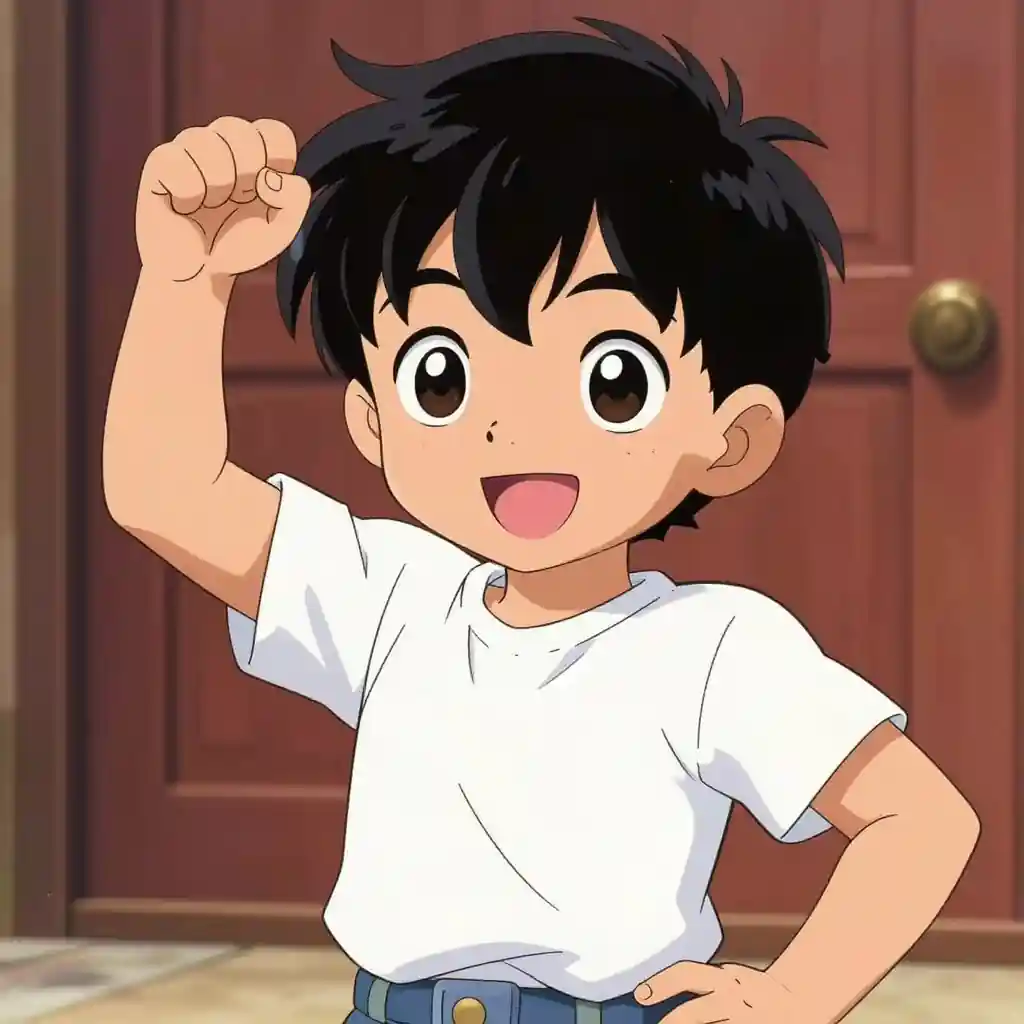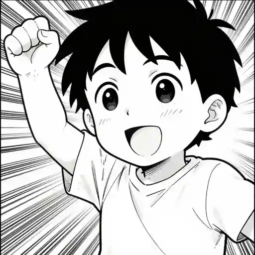 Create an image in a highly expressive manga style. The character should have expressive eyes and a dynamic pose, with clean linework and bold. Cheerful hero scene, expressive lighting, rich background detail, child-safe creator-ready AI art, image-only composition, No text, no words, no letters, no typography, no captions, no labels, no logos, no signage, no watermark.