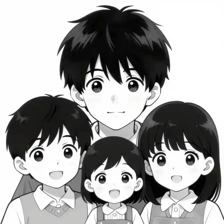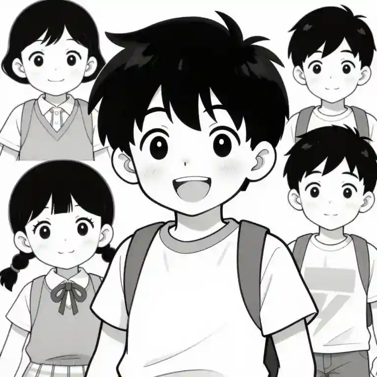 Wholesome japanese manga comic style illustrations with clear emotion, readable subjects, and family-friendly details.