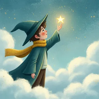 Whimsical Wizard Boy Touches the Golden Star
