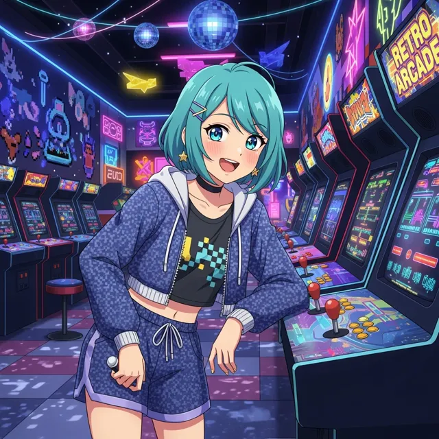 Retro Arcade Star radiates exuberance in a vivid arcade, surrounded by old-school machines and neon lights.