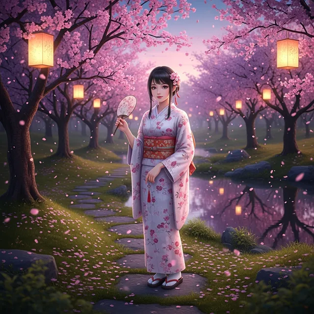 Sakura Blossom Muse basks in tranquility beneath a cherry blossom tree, her delicate fan reflecting timeless grace.