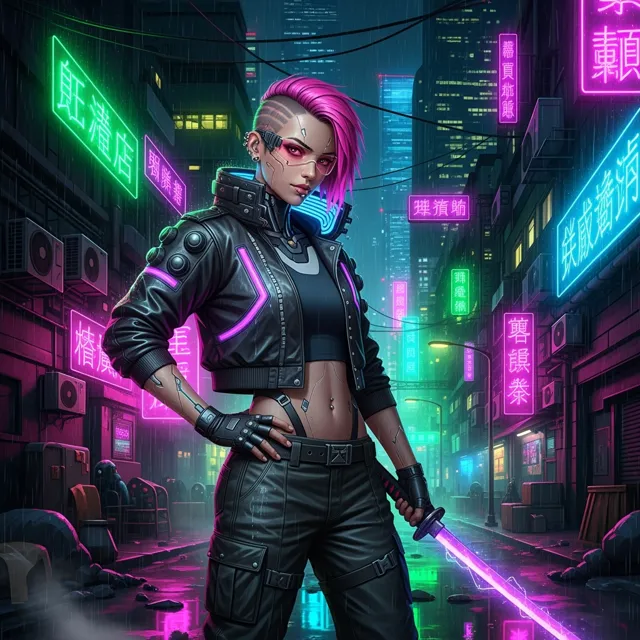 Cyberpunk Rebel stands confidently in a neon-lit city, challenging the gritty world with her resolve and high-tech gear.