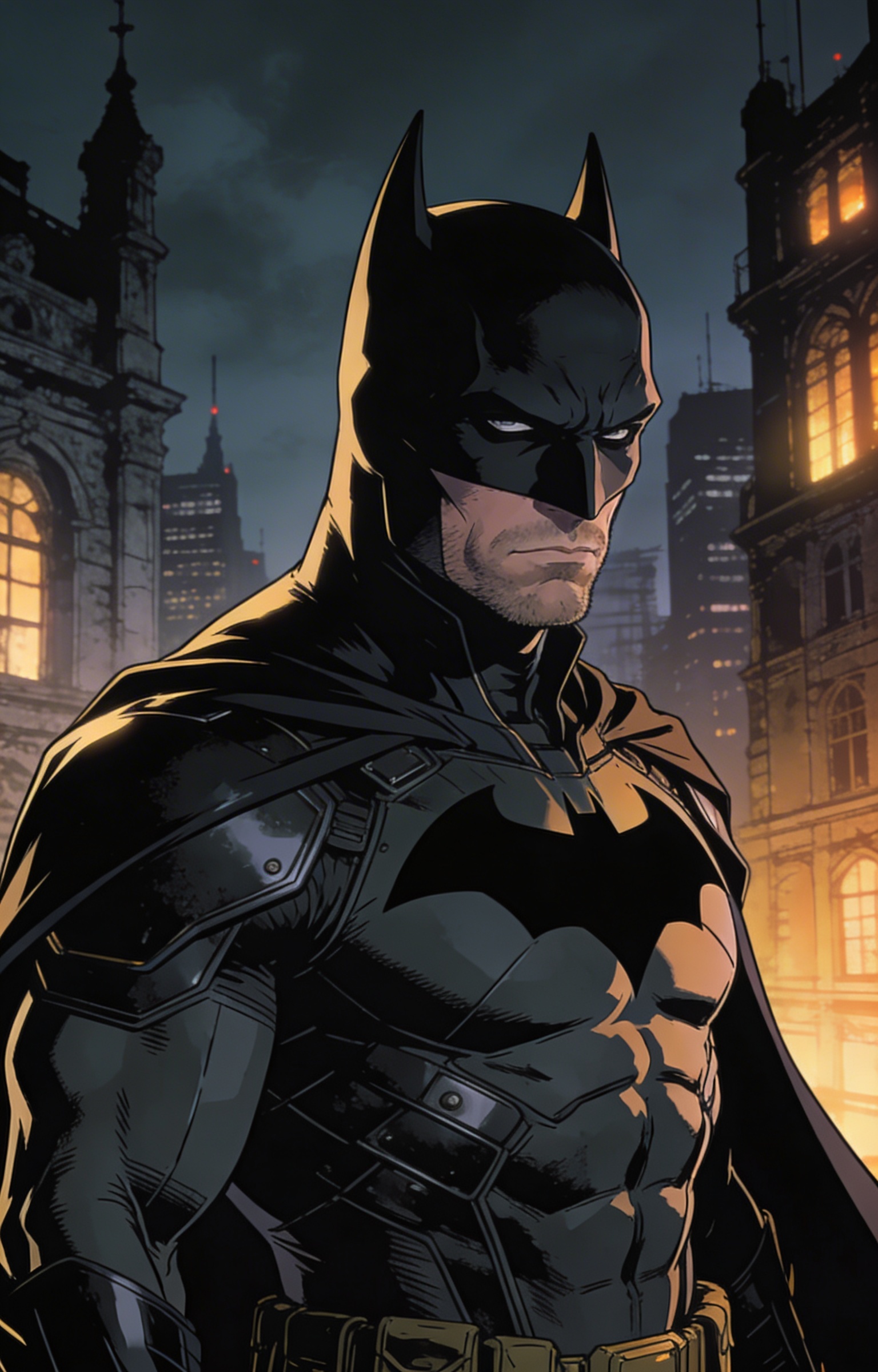 ((masterpiece,best quality)) realistic character illustration, one male, caucasian, 35 years old, Muscular bodytype, dark vigilante armor with cape silhouette, gothic city lighting, and detective gravitas, Batman fan collection character reference, cinematic lighting, polished ai character maker output