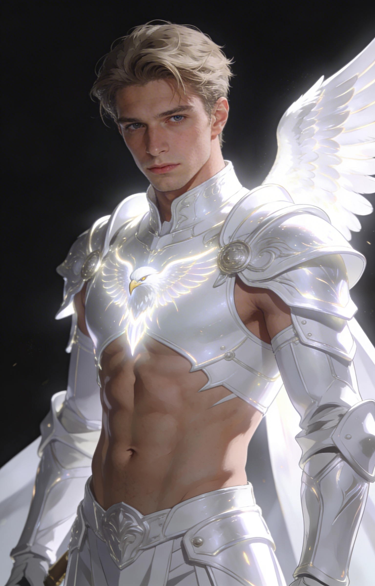 ((masterpiece,best quality)) realistic character illustration, one male, caucasian, 24 years old, Lean bodytype, radiant white commander armor with ethereal ambition, hawk-like elegance, and battlefield gravitas, Griffith fan collection character reference, cinematic lighting, polished ai character maker output