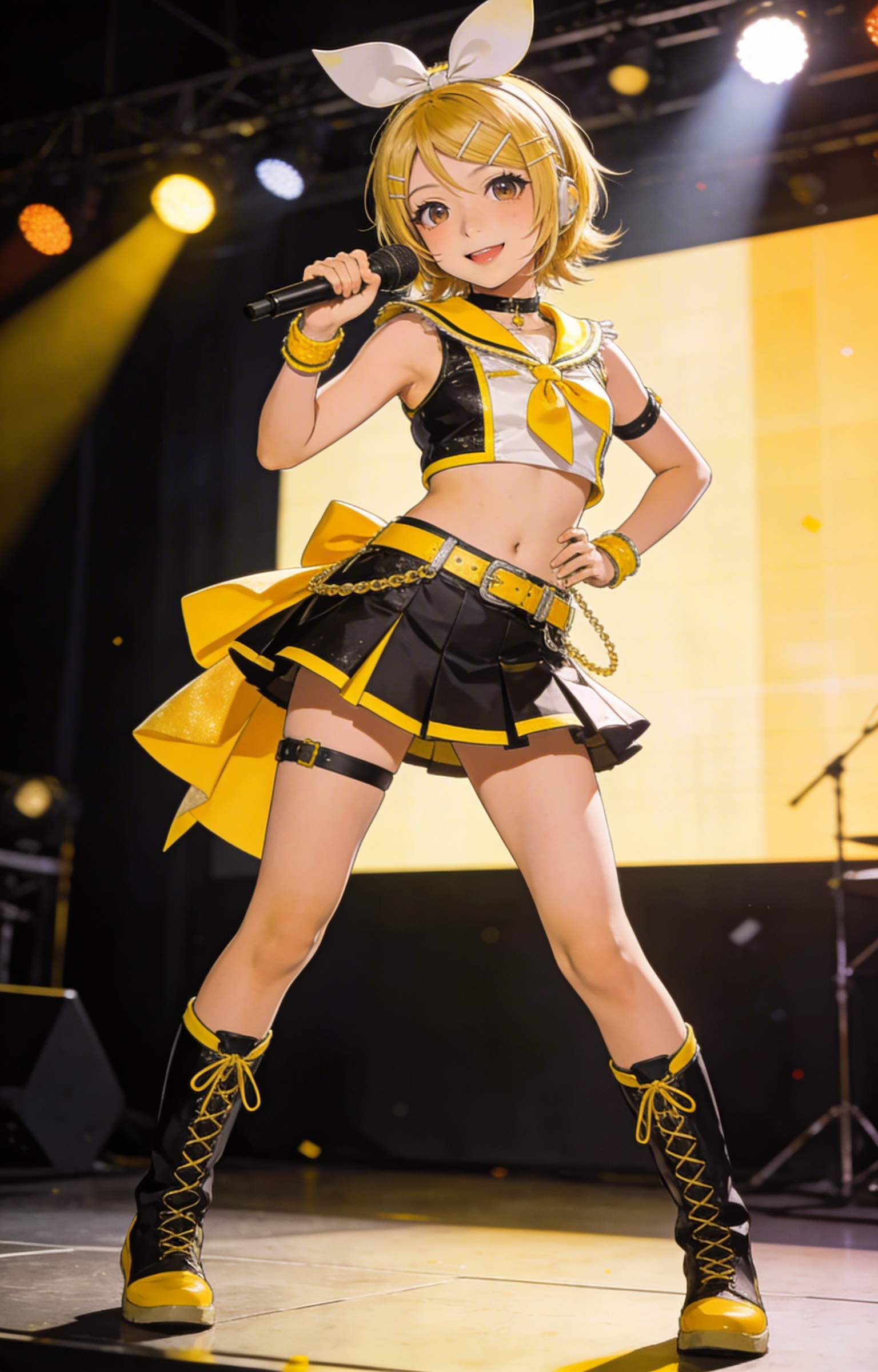 ((masterpiece,best quality)) realistic character illustration, one female, asian, 14 years old, Petite bodytype, yellow-accented vocal synth costume with energetic stage styling and pop-idol confidence, Kagamine Rin fan collection character reference, cinematic lighting, polished ai character maker output