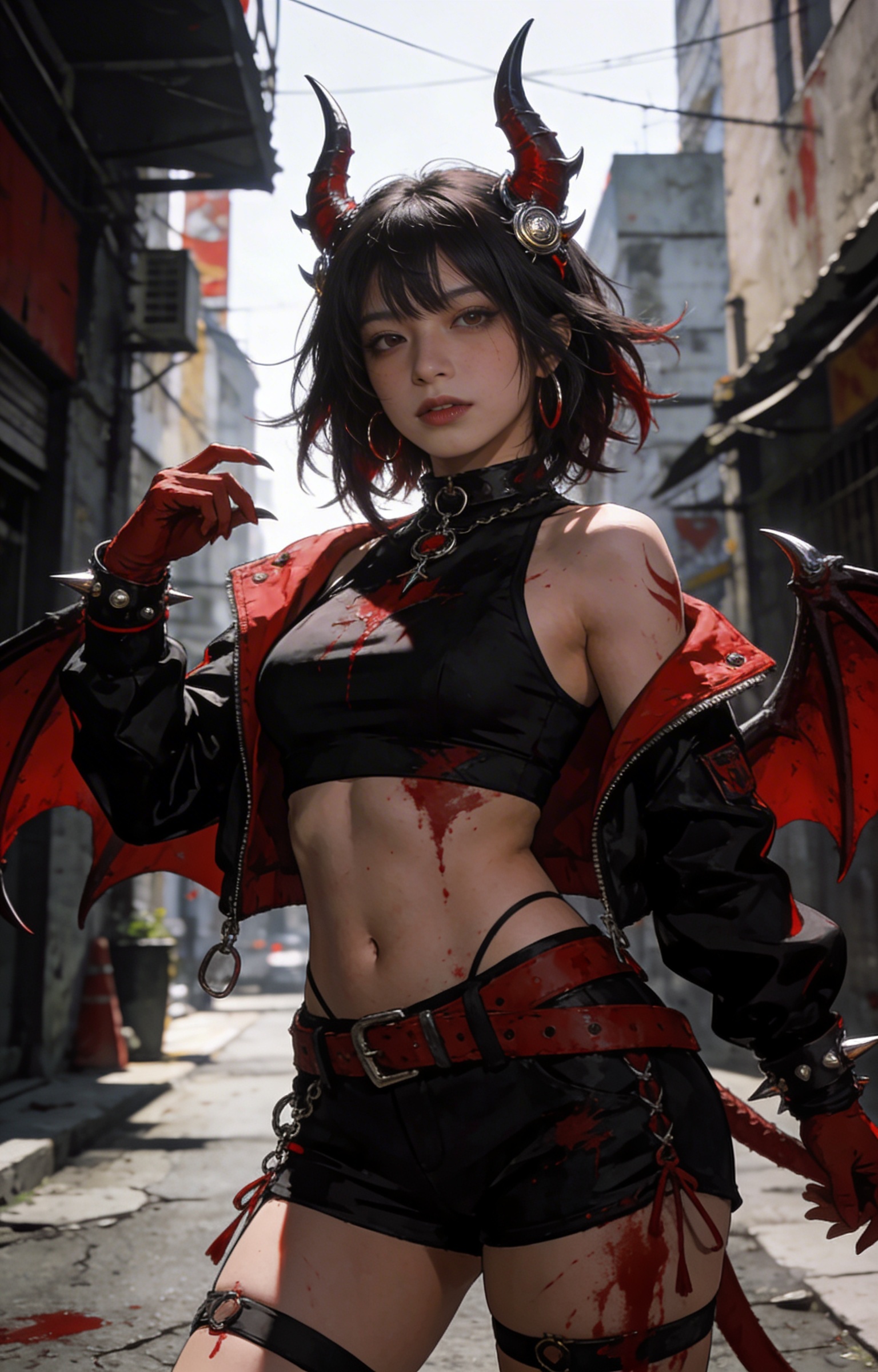((masterpiece,best quality)) realistic character illustration, one female, asian, 20 years old, Athletic bodytype, chaotic fiend styling with sharp horns, oversized attitude, and blood-fueled street energy, Power fan collection character reference, cinematic lighting, polished ai character maker output