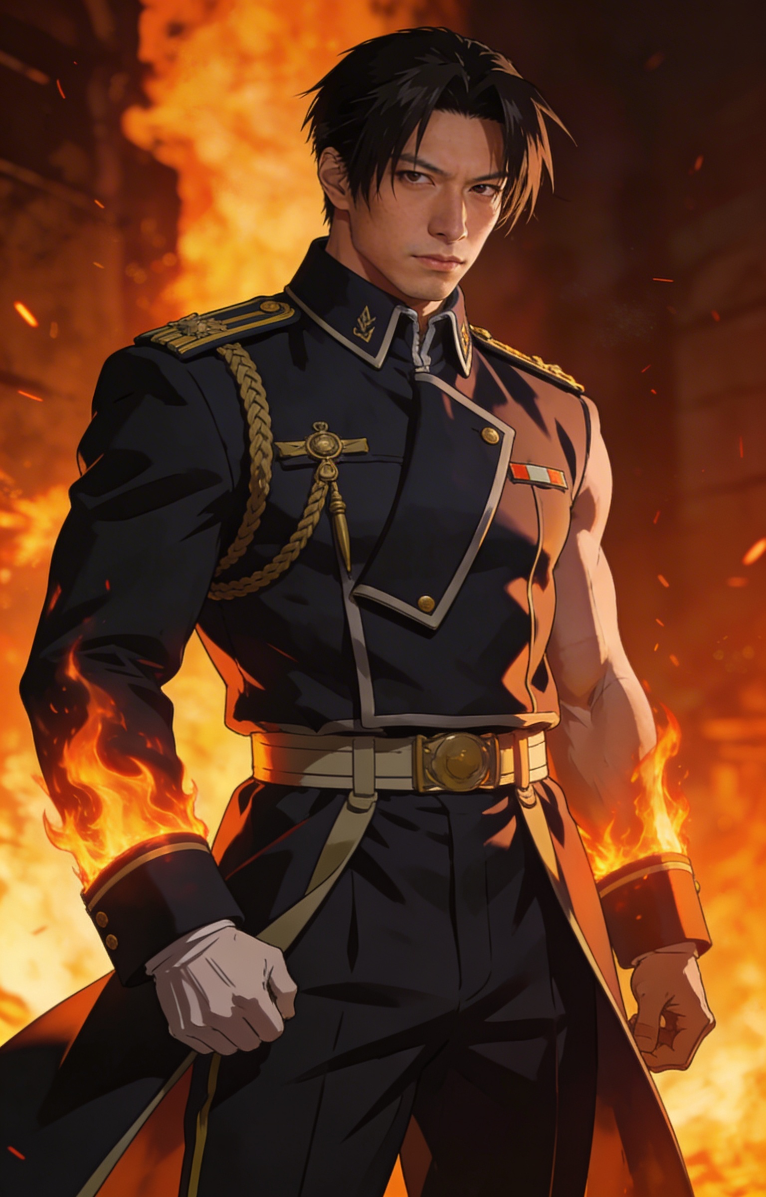 Roy Mustang inspired hero character standing in a cinematic key art pose with strong silhouette and dramatic lighting.