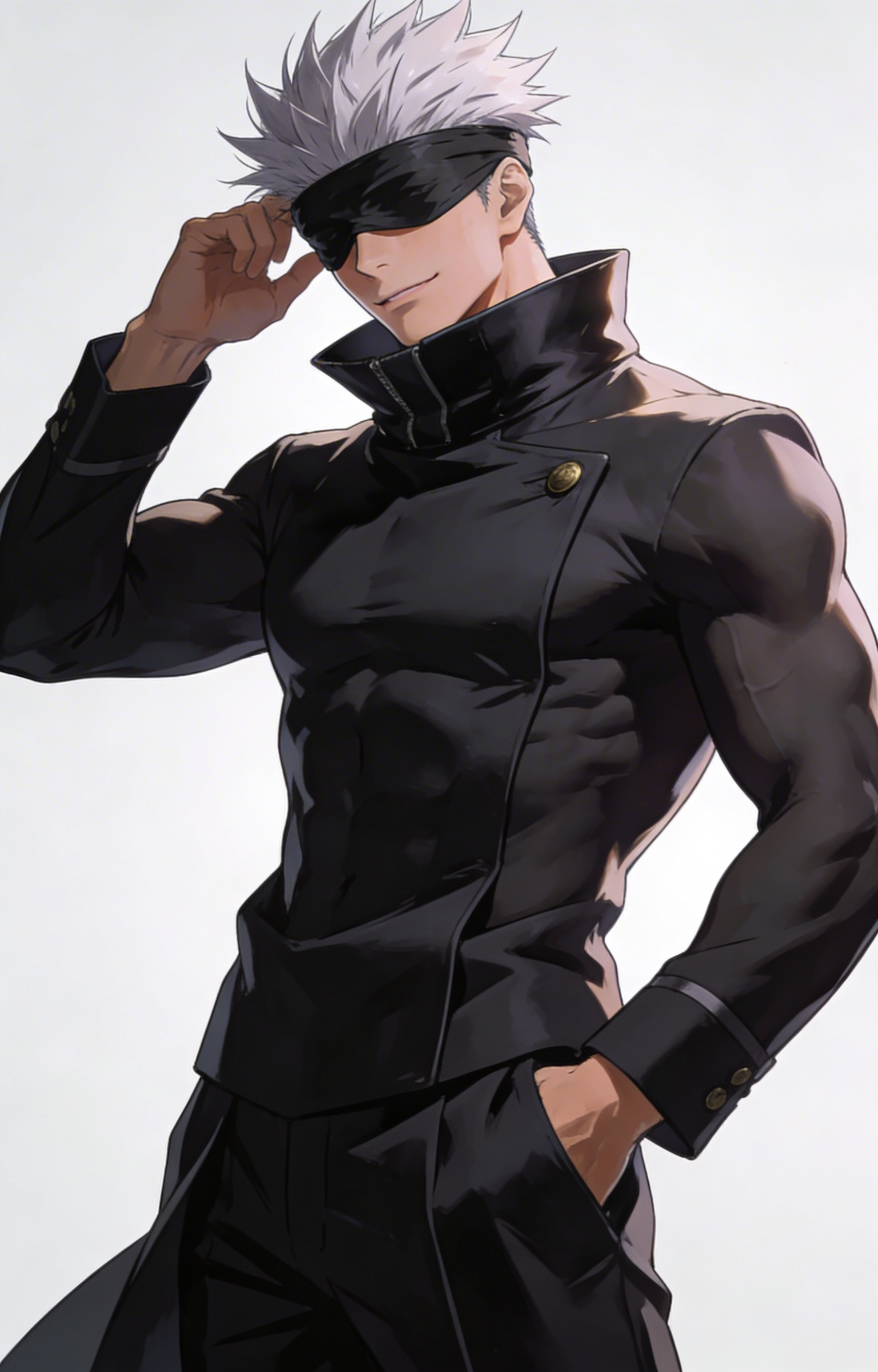 ((masterpiece,best quality)) realistic character illustration, one male, asian, 28 years old, Lean bodytype, modern sorcerer uniform with blindfold styling, high collar, and overwhelming confident stance, Satoru Gojo fan collection character reference, cinematic lighting, polished ai character maker output