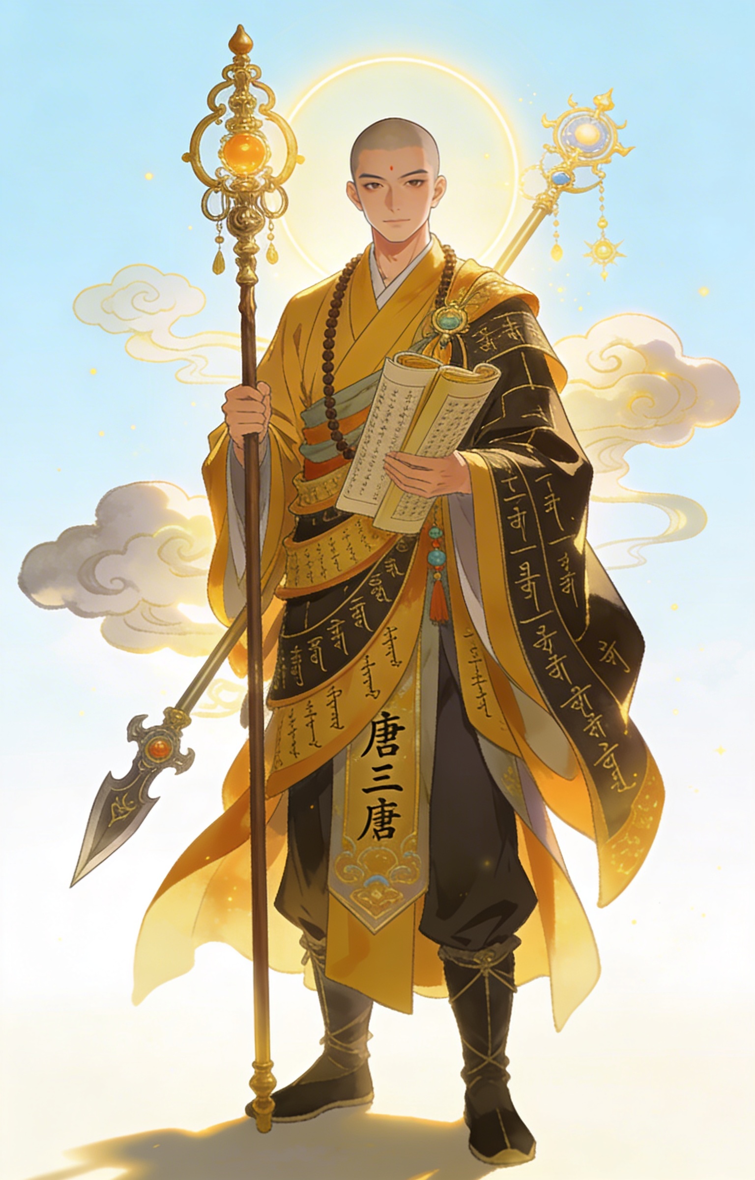 ((masterpiece,best quality)), stylized historical-fantasy character illustration, one male, asian, 28 years old, Lean bodytype, full body character design, standing full-body portrait, head-to-toe framing, single upright character, Chinese classical beauty, warm daylight, bright balanced palette, elegant traditional aesthetics, friendly righteous positive energy, culturally respectful visual tone, sacred monk robes with scripture textures, pilgrimage aura, and calm enlightened presence, pilgrimage staff and scripture scrolls, calm monk face, sacred robe layers, compassionate enlightened posture, serene and benevolent cultural dignity, Tang Sanzang classical fan collection character reference, ornate costume detail, clear silhouette, iconic props, original high-quality character design, avoid dark horror mood, avoid villainous menace, avoid oppressive shadows, avoid gritty realism, friendly, bright, dignified, heroic, positive and culturally uplifting portrayal, single character only, no text, no logo, no watermark