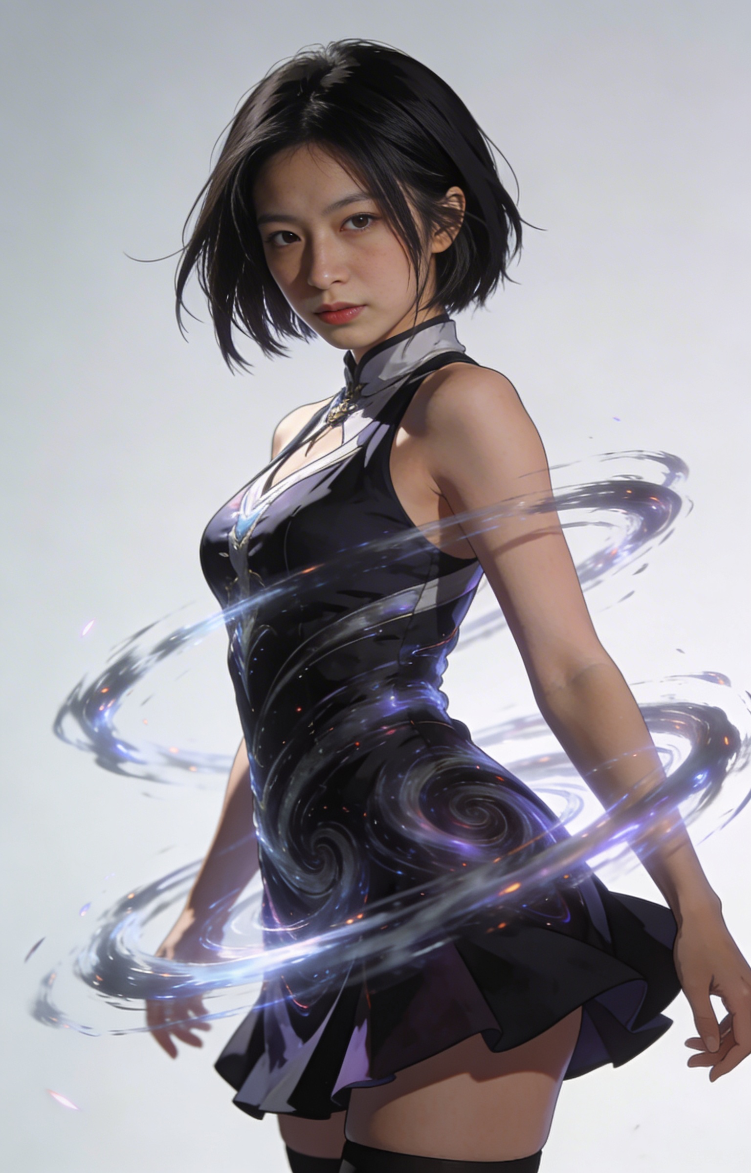 ((masterpiece,best quality)) realistic character illustration, one female, asian, 28 years old, Petite bodytype, psychic hero dress with swirling telekinetic motion and compact, dominant silhouette, Tatsumaki fan collection character reference, cinematic lighting, polished ai character maker output
