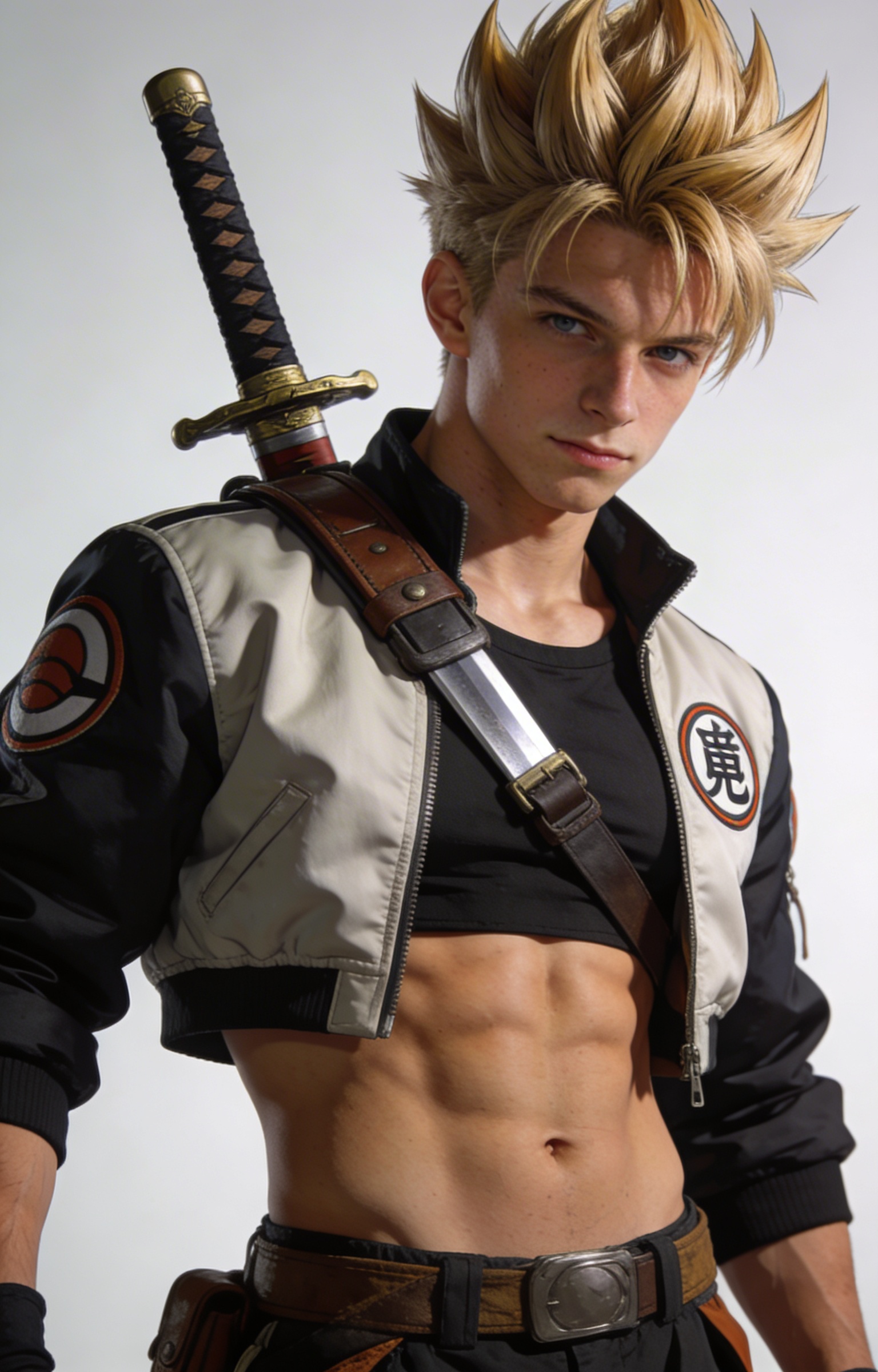 ((masterpiece,best quality)) realistic character illustration, one male, caucasian, 18 years old, Athletic bodytype, capsule corp fighter styling with cropped jacket, sword harness, and time-travel hero confidence, Trunks fan collection character reference, cinematic lighting, polished ai character maker output
