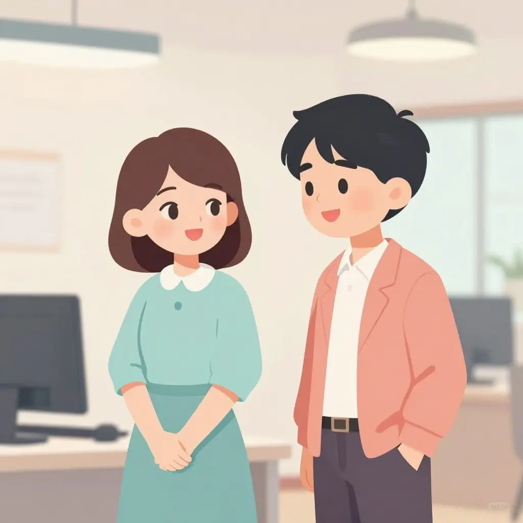 Wholesome animated office chat: a whimsical workplace tale illustrations with clear emotion, readable subjects, and family-friendly details.