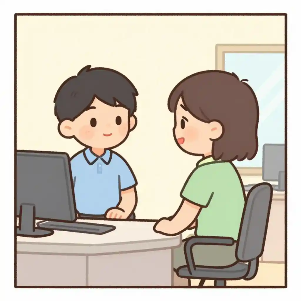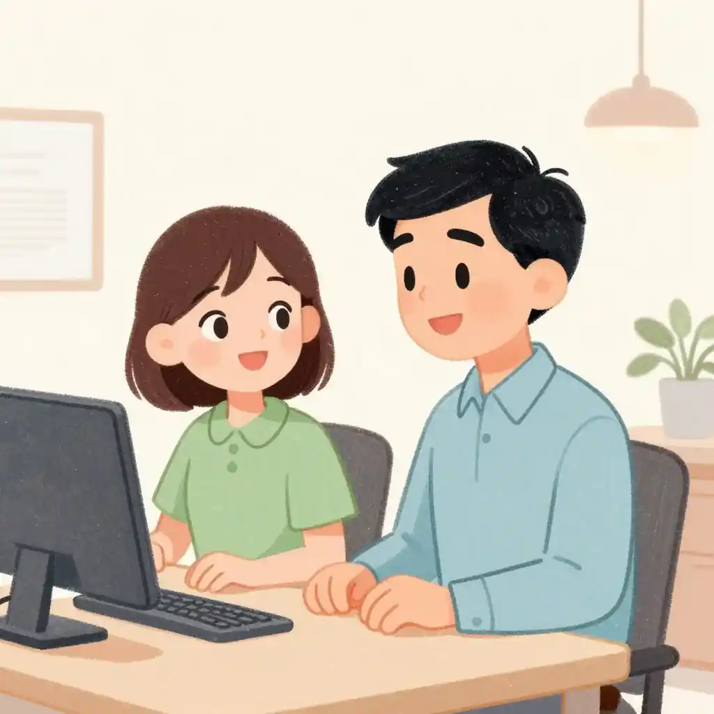 Hand-drawn cartoon scene of two coworkers in pastel colors, modern office, soft lighting, minimal background, friendly collaboration, side view. Family-friendly original character portrait, polished composition, wholesome mood, image-only scene, No text, no words, no letters, no typography, no captions, no labels, no logos, no signage, no watermark.