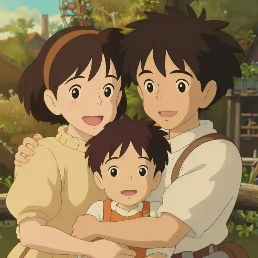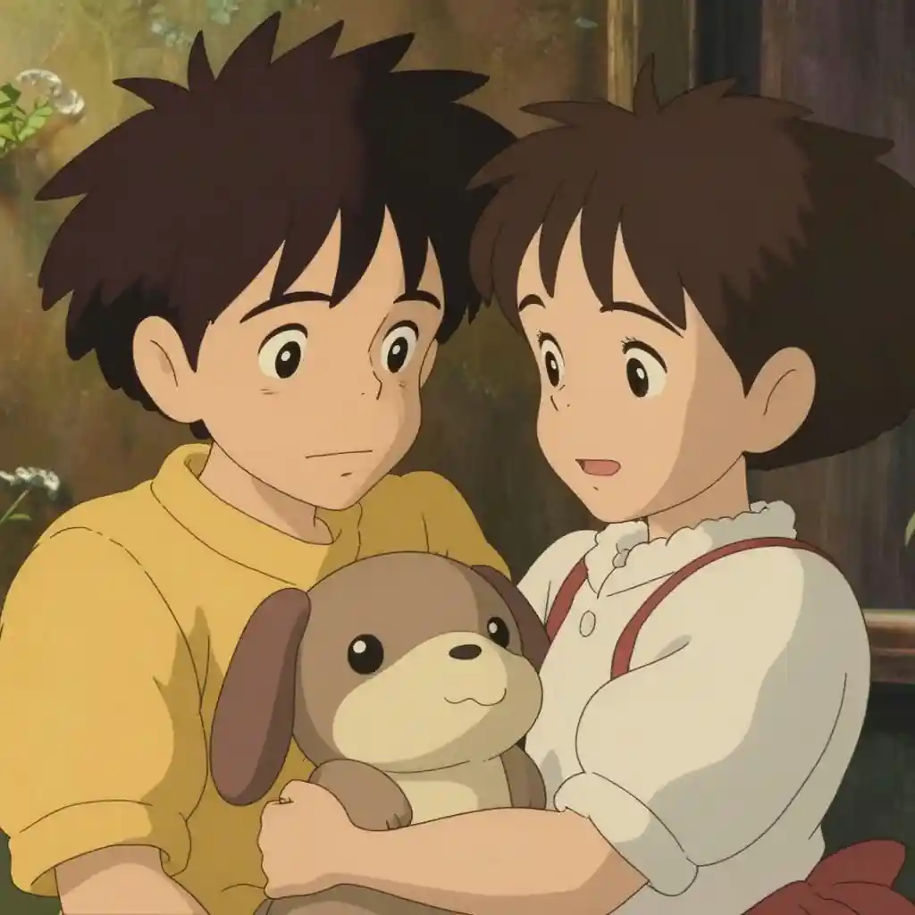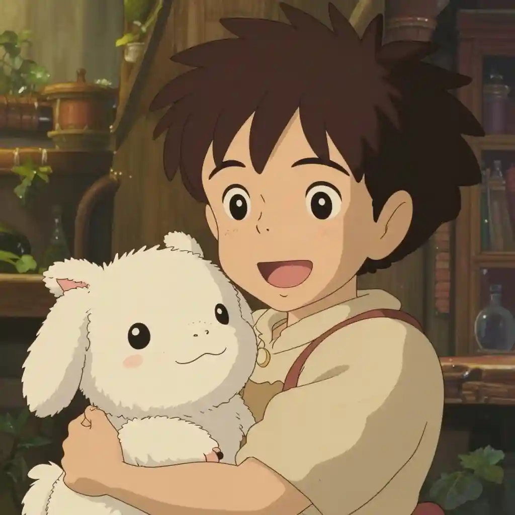 The source template points toward anime-inspired, warm earth tones, soft lighting, gentle expressions, nostalgic rural setting, whimsical plush creature, intimate close-up, painterly background, serene mood, studio vibes. Use that as a style brief, then add your own cast, setting, emotion, camera angle, and scene purpose.