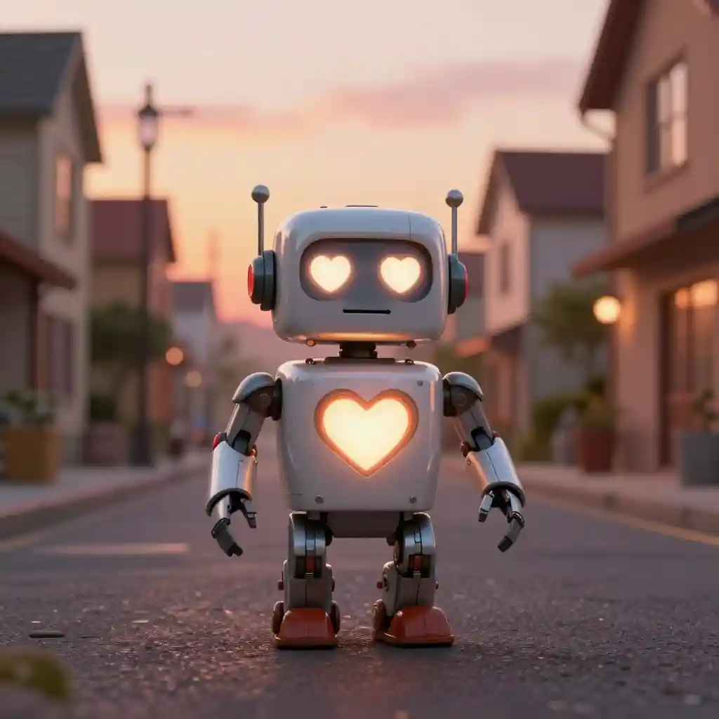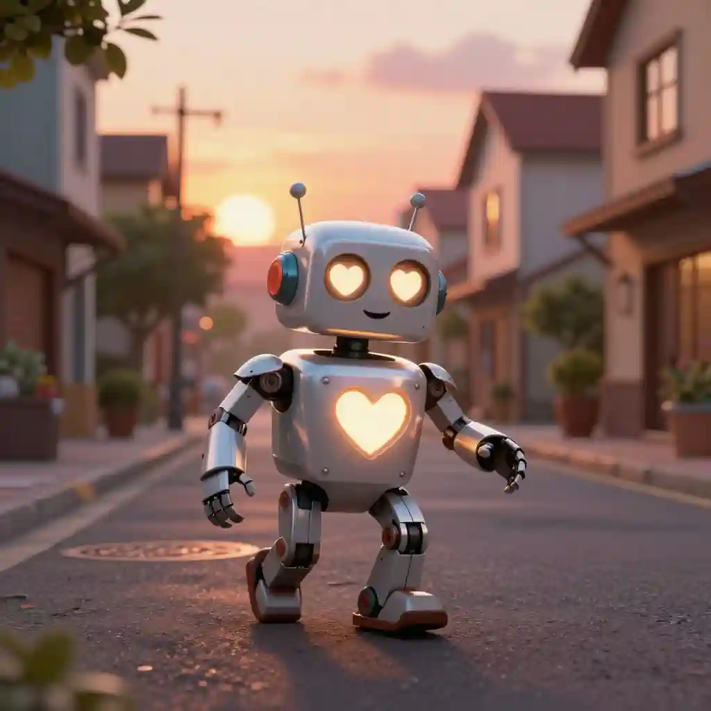 Create a dynamic and emotionally engaging scene set in a quaint, small-town street at sunset. The central focus is a vintage-style robot with expressive, heart-shaped eyes and a glowing heart-shaped light on. Cheerful hero scene, expressive lighting, rich background detail, child-safe creator-ready AI art, image-only composition, No text, no words, no letters, no typography, no captions, no labels, no logos, no signage, no watermark.