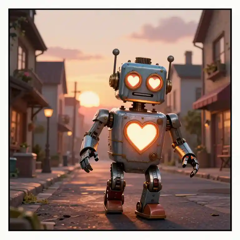The source template points toward create a dynamic and emotionally engaging scene set in a quaint, small-town street at sunset. the central focus is a vintage-style robot with expressive, heart-shaped eyes and a glowing heart-shaped light on its chest. Use that as a style brief, then add your own cast, setting, emotion, camera angle, and scene purpose.