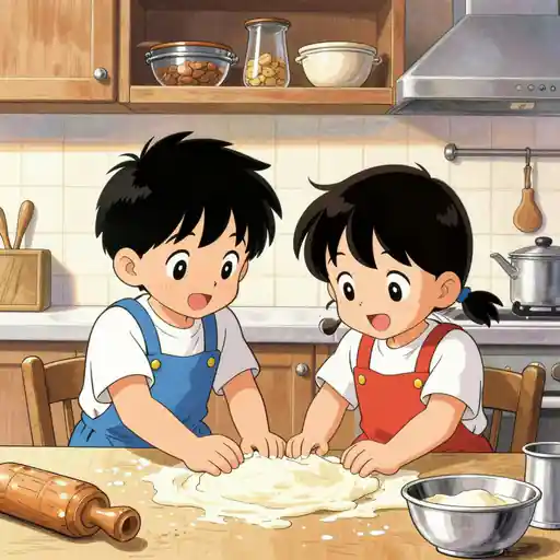 Create a heartwarming, nostalgic illustration of two children baking in a cozy, sunlit kitchen. The style should be classic manga with clean linework, dynamic action lines, and expressive. Cheerful hero scene, expressive lighting, rich background detail, child-safe creator-ready AI art, image-only composition, No text, no words, no letters, no typography, no captions, no labels, no logos, no signage, no watermark.