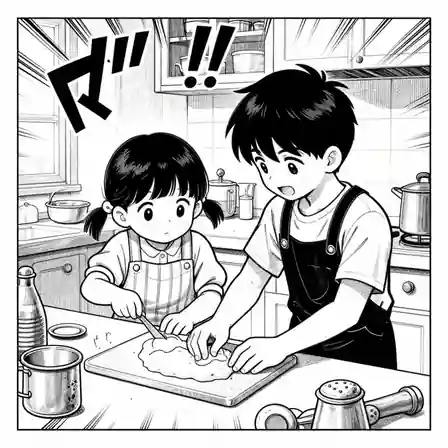 The source template points toward create a heartwarming, nostalgic illustration of two children baking in a cozy, sunlit kitchen. the style should be classic manga with clean linework, dynamic action lines, and expressive. Use that as a style brief, then add your own cast, setting, emotion, camera angle, and scene purpose.