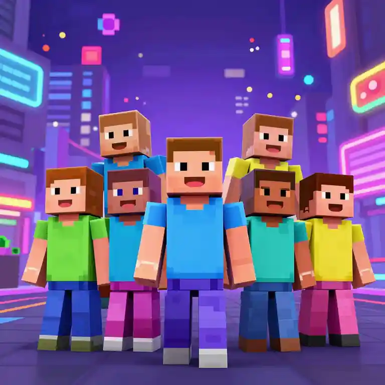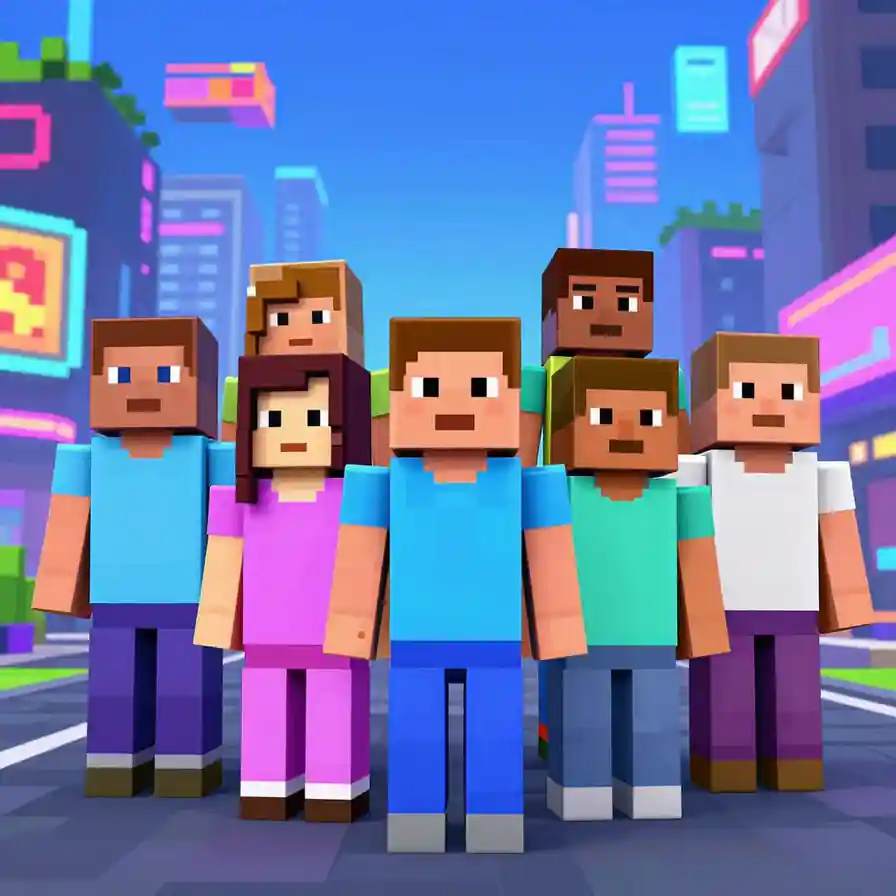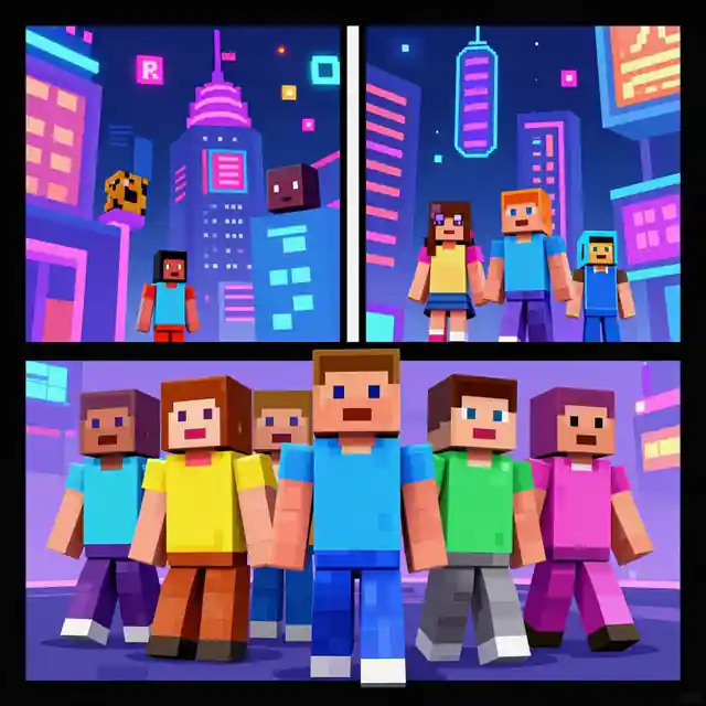 The source template points toward a vibrant roblox comic scene featuring a group of blocky avatars in a neon-lit city hub, pixelated art style. Use that as a style brief, then add your own cast, setting, emotion, camera angle, and scene purpose.