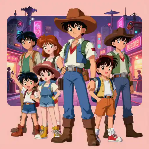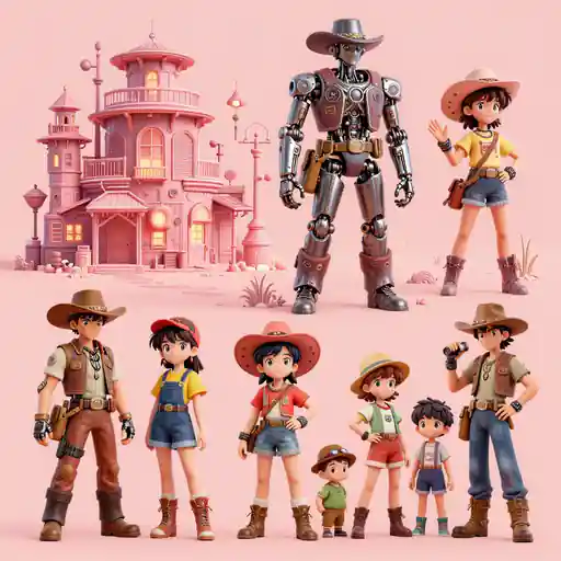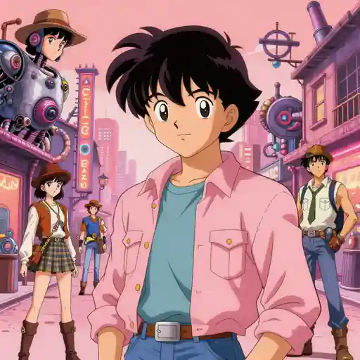 anime-manga hybrid style, 80s manga style , neon-western hybrid townscape, Pantone Peach Fuzz base , Yoji Shinkawa-style mechanical detail , hyper-detailed character design sheet, 8k resolution,. Cheerful hero scene, expressive lighting, rich background detail, child-safe creator-ready AI art, image-only composition, No text, no words, no letters, no typography, no captions, no labels, no logos, no signage, no watermark.