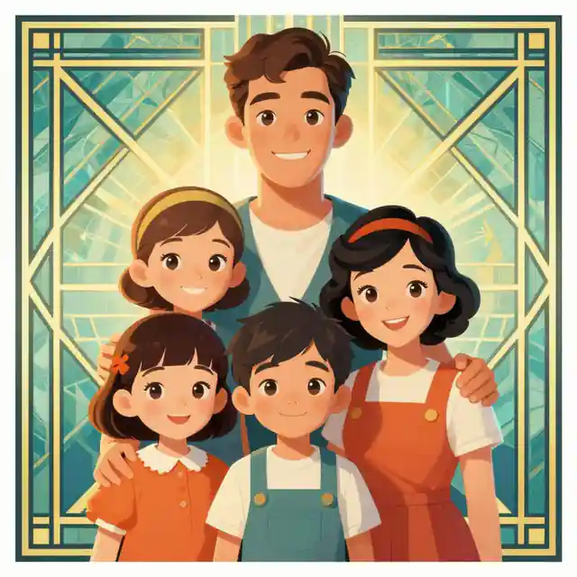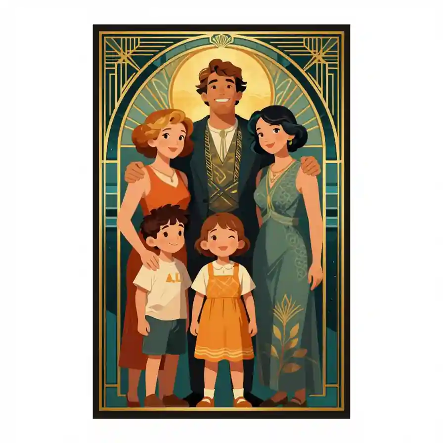 Wholesome art deco poster illustrations with clear emotion, readable subjects, and family-friendly details.