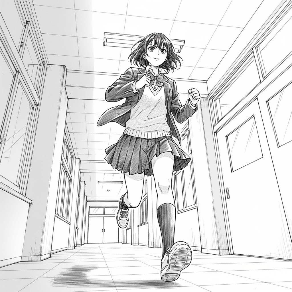Use this workflow when you need a character concept, comic panel, picture book moment, anime key visual, or animation reference in a consistent high-contrast manga school courtyard scene look.