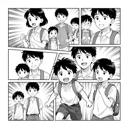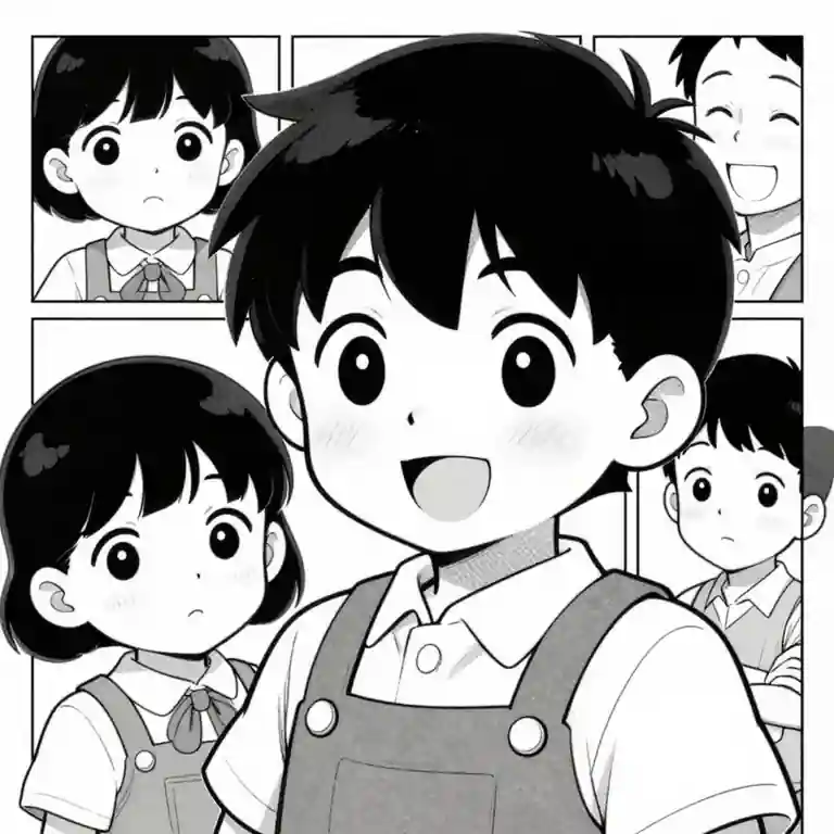 black-and-white manga illustration. Cheerful hero scene, expressive lighting, rich background detail, child-safe creator-ready AI art, image-only composition, No text, no words, no letters, no typography, no captions, no labels, no logos, no signage, no watermark.