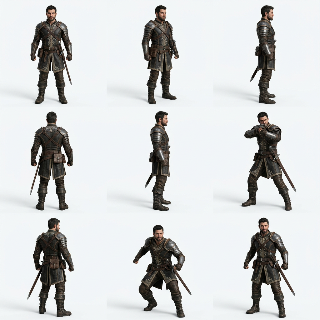 A premium game-ready 3x3 character sheet, exactly nine full-body poses of the same hero, identical face and outfit in every cell, exact 3x3 grid layout, white seamless background, strong spacing between subjects, no overlap, no text, no watermark, print-ready composition, production quality, front/side/back pose diversity, full body fully visible in every cell, ultra high-definition 4k quality, photorealistic photography style, DSLR quality, crisp textures, tack-sharp focus, clean edges, natural cinematic lighting, highly detailed skin, fabric, and accessories, no blur, no haze, no artifacts