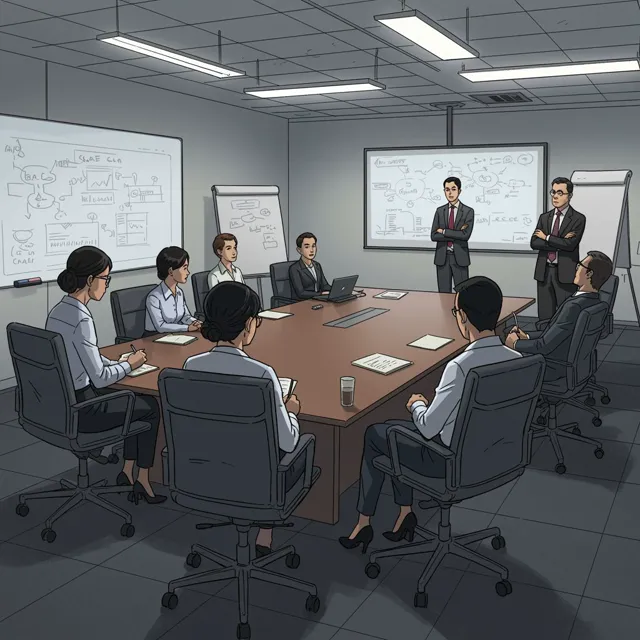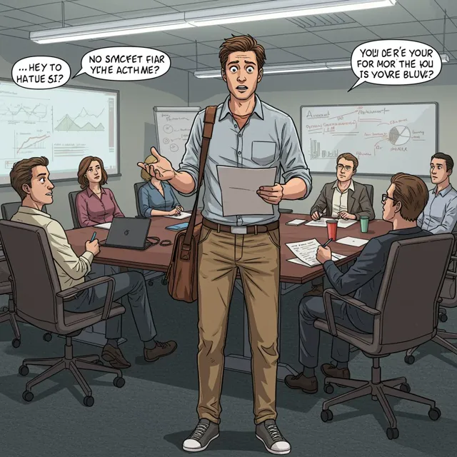 The meeting resumes, but the office atmosphere becomes noticeably lighter.