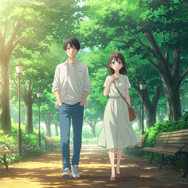 Two protagonists begin to engage with each other casually while strolling in an urban park.