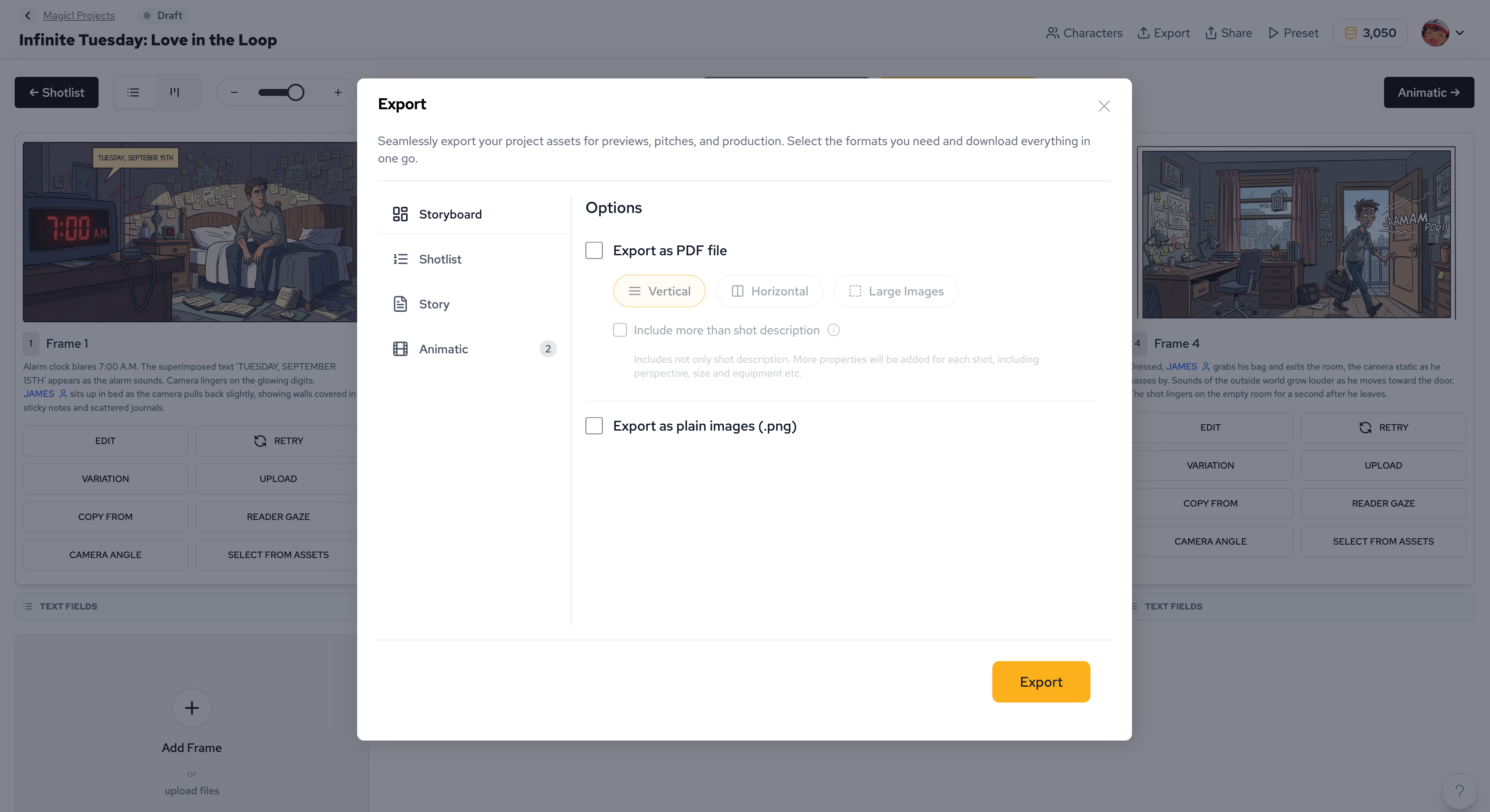 Export your storyboards in multiple professional formats, including storyboard, shot list, PDF, and MP4. This flexibility supports publishing, animation, and cross-platform distribution, making it easy to deliver your content to print, digital, and video channels.
