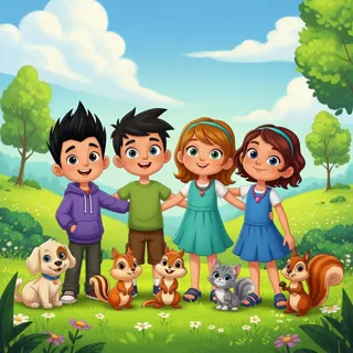 Vivid Cartoonish Outdoor Scene with Diverse Characters in Whimsical Style