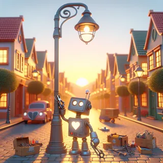 Create a dynamic and emotionally engaging scene set in a quaint, small-town street at sunset. The central focus is a vintage-style robot with expressive, heart-shaped eyes and a glowing heart-shaped light on its chest, diligently fixing an ornate, old-fashioned streetlamp. The scene is bathed in high-contrast, dramatic lighting from the setting sun, creating bold shadows and highlights. The cobblestone street stretches into the distance, flanked by rows of charming, uniform houses with gabled roofs and neatly trimmed spherical topiary trees. Scattered tools and toolboxes around the robot emphasize its industrious nature, with dynamic action lines showing its movement. Additional elements like classic cars and subtle background details blend into the scene, adding depth and a sense of a lived-in, nostalgic world. The composition uses dynamic, diagonal panels and cinematic angles to enhance the emotional impact.