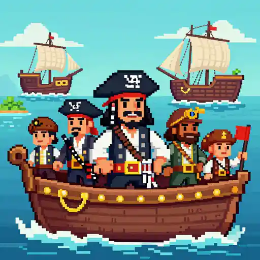 a comic in a retro pixel art style, featuring swashbuckling pirates on a treasure hunt. With rolling seas, hidden islands, and epic ship battles, the crew braves every storm in search of glory. Cheerful hero scene, expressive lighting, rich background detail, child-safe creator-ready AI art, image-only composition, No text, no words, no letters, no typography, no captions, no labels, no logos, no signage, no watermark.